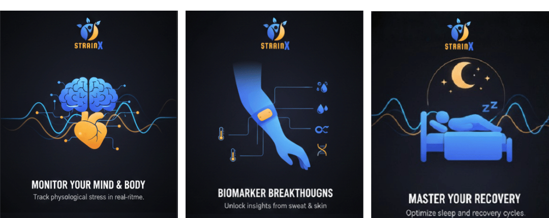 StrainX combines heart rate variability, electrodermal activity, skin temperature, sleep patterns, and sweat biomarkers to deliver a complete picture of physical and mental strain.