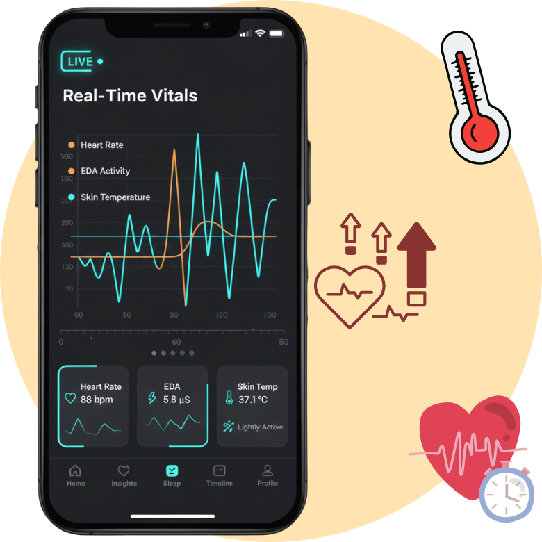 StrainX continuously tracks physiological signals to measure stress, recovery, and body load in real time, transforming raw biomarker data into clear, actionable insights.