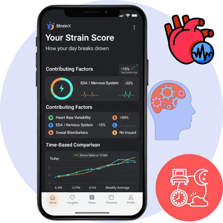 StrainX translates complex physiological data into an easy-to-understand Strain Score, helping users identify stress triggers, optimize recovery, and prevent burnout.