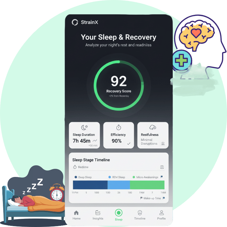 StrainX evaluates sleep quality and recovery patterns to show how well the body resets from daily stress, enabling smarter decisions around rest and performance.